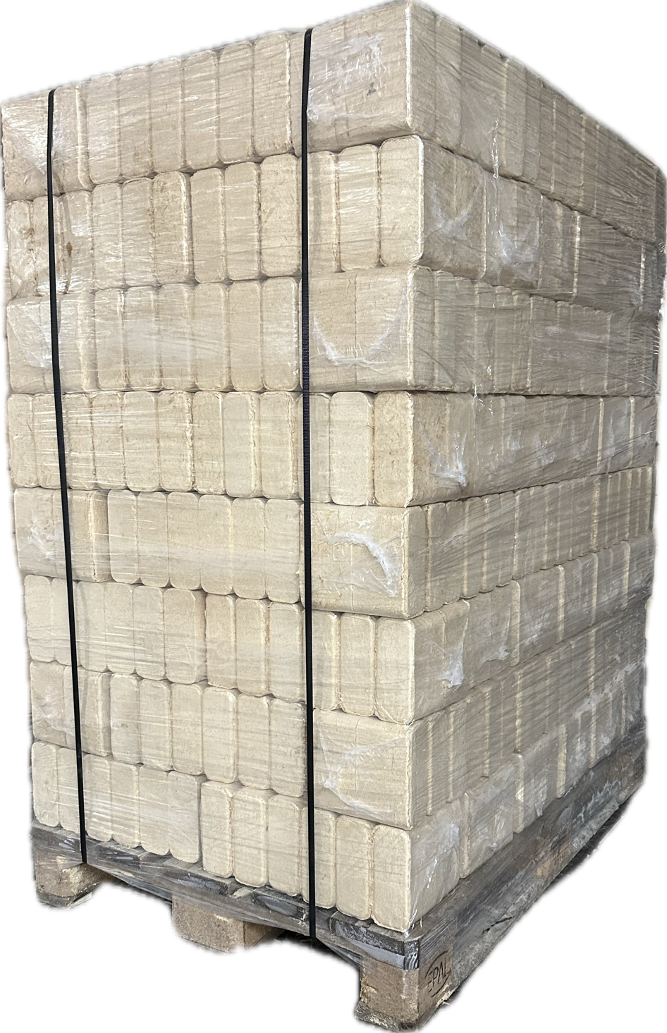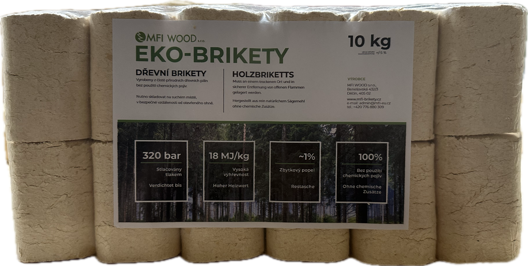 MFI WOOD s.r.o. vyrábí brikety nejvyšší kvality jako souběh hlavní produkce spárovky. Tyto brikety vyrábíme na renomovaných německých lisech značky RUF. Brikety jsou lisovány tlakem až 300 barů ze směsi štěpky, hoblin a prachu z broušení bez použití jakýchkoliv pojiv a tím se stávají zcela ekologické. Vzhledem ke skutečnosti, že dovážíme pouze čisté vysušené řezivo bez kůry, dosahují naše brikety nejvyšších možných parametrů.